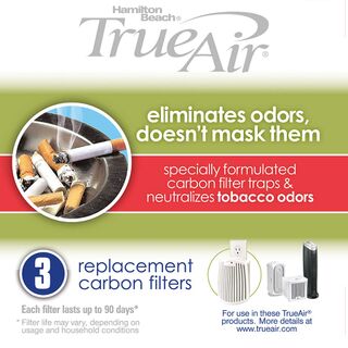 Easily replace your TrueAir® filters, specially formulated with carbon filter traps made to neutralize tobacco odors. This package contains 3 filters, made to last up to 90 days.* These filters will work with the following TrueAir® Odor Eliminators: