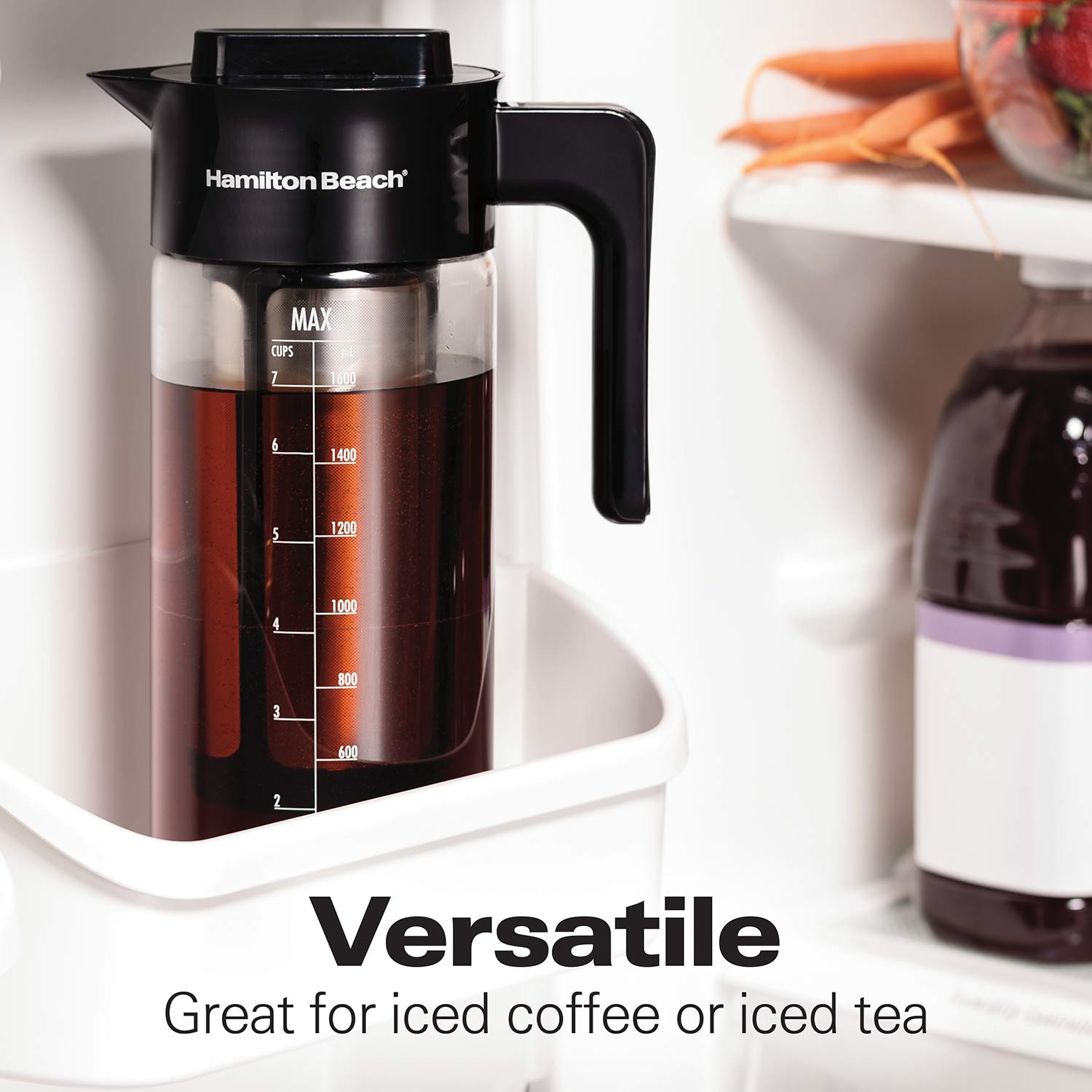 Enjoy less acidic, smooth-tasking cold brew coffee every day with the Hamilton Beach® Cold Brew Coffee Maker. It makes perfect, rich cold brew coffee and iced tea in 3 simple steps: 1) fill carafe with water; 2) fill infuser with coffee or tea; 3) add lid, gently shake pitcher and place in the refrigerator for 12-36 hours. The extra-large BPA-free pitcher brews 1.7 L (57.5 oz.) of coffee or tea concentrate for multiple servings. Coffee or tea brews in the pitcher overnight so it's ready to serve in the morning when you wake up or anytime you need a cool beverage. The borosilicate glass pitcher is durable, BPA-free and dishwasher safe for easy cleaning. The durable stainless steel infuser holds ground coffee, tea bags and loose tea, or make flavorful fruit-infused water using your favorite fruits. The infuser's fine mesh keeps grounds out of coffee, and the bottom cap removes for easy grounds disposal. The cold brew coffee maker is compact and easy to store in the refrigerator without taking up a lot of space. Finally, you can treat yourself to your favorite cold brew lattes and coffees at home without trips to the coffee shop or the expense.