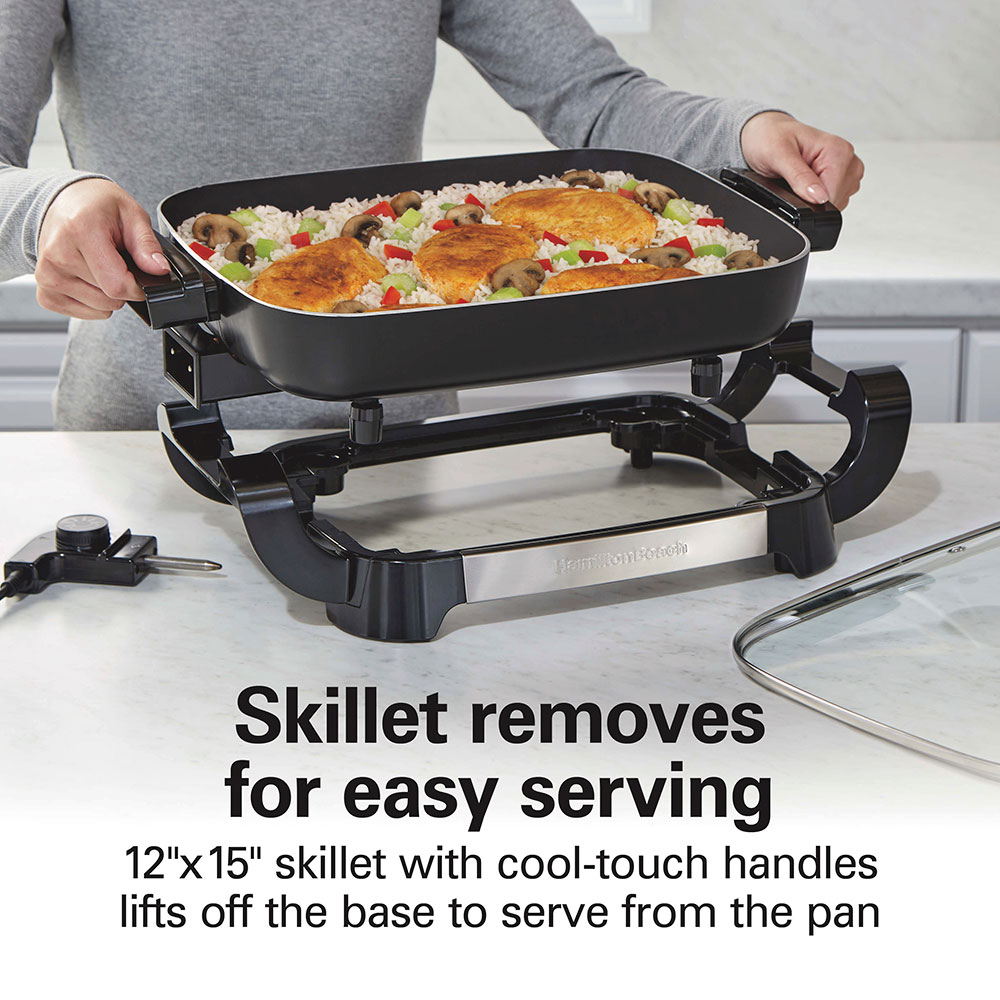 The Hamilton Beach® Durathon® Reversible Ceramic Skillet has 180 sq. in. of nonstick cooking surface so you can sauté, stir fry, simmer or braise family meals in one pan. There's no need to dirty a second pan. The skillet is perfect for cooking everything from hearty breakfasts and dinners to keeping appetizers warm on the buffet while entertaining. The electric skillet's convenient reversible design lets you use the cord on either side, so there's no need to worry about the layout of your kitchen or the distance to an outlet.
