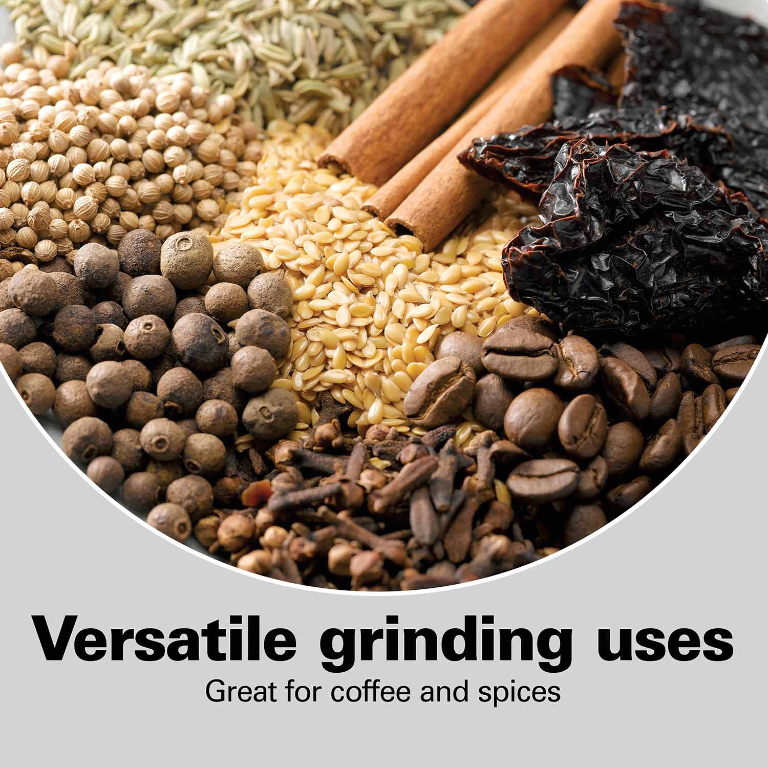 The Hamilton Beach® Fresh Grind™ Coffee Grinder is quieter than the leading competitor, which means you can turn your favorite coffee beans into fresh grounds with less noise. This electric coffee grinder makes quick work of turning your beans into grounds for brewing. The durable stainless steel blades can also grind spices, and the removable grinding chamber makes filling and cleanup easy. The cord wraps around the base in a hidden compartment for neat storage.