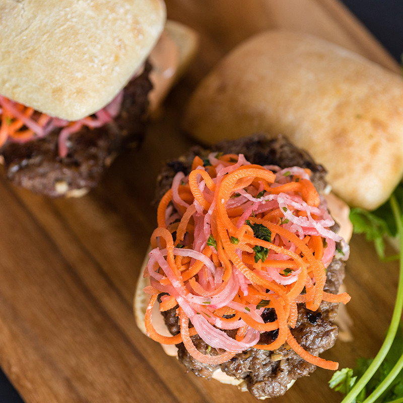 - Remove the burgers from the grill and serve on small ciabatta rolls with Sriracha Mayonnaise and Pickled Radish Slaw.